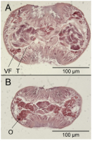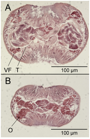 FIGURE 5. Light micrographs of sections of Caulobothrium multispelaeum n. sp. stained with Delafield’s hematoxylin and counter-stained with eosin. A. Cross section of mature proglottid of C. multispelaeum n. sp. anterior to cirrus sac. B. Cross section of mature proglottid of C. multispelaeum n. sp. at level of ovarian isthmus. Abbreviations: O, ovary; T, testis; VF, vitelline follicle.