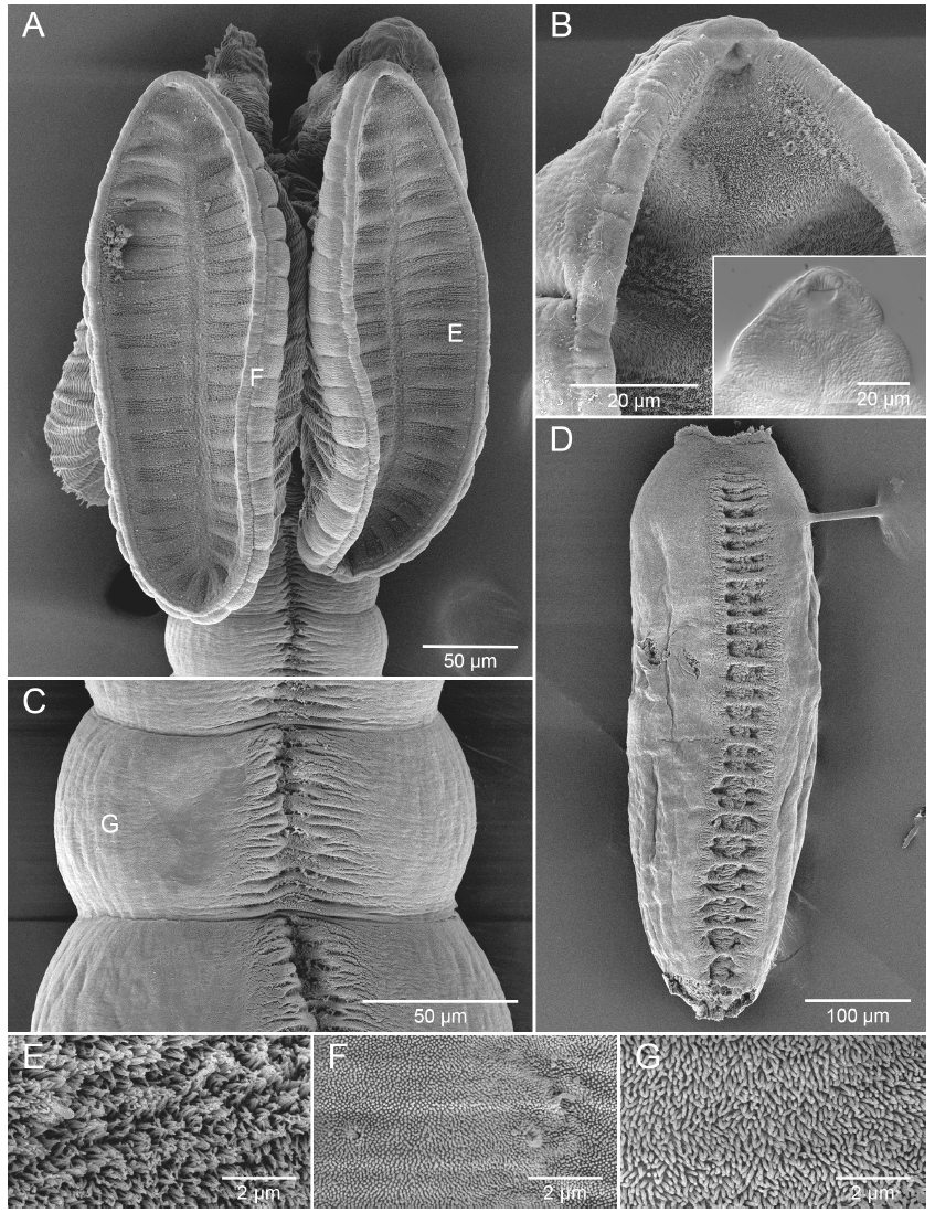 A. Scolex; small letters indicate locations of details in E and F. B. Anterior region of bothridium showing apical sucker; inset light micrograph of same region. C. Medial longitudinal groove on immature proglottids; small letter indicates location of detail in G. D. Mature proglottid with medial longitudinal groove expanded laterally to form tandem series of elliptical apertures. E. Distal surface of bothridium. F. Proximal surface of bothridium. G. Surface of strobila.