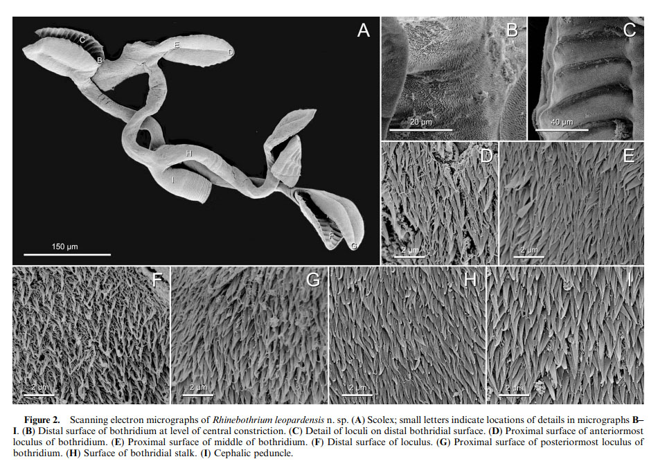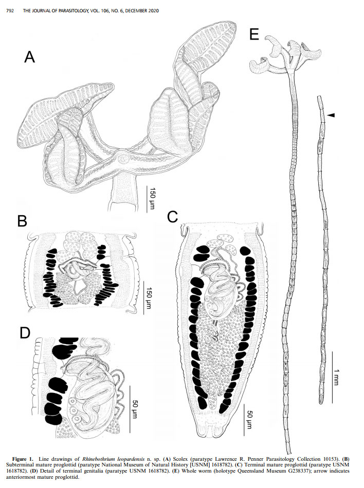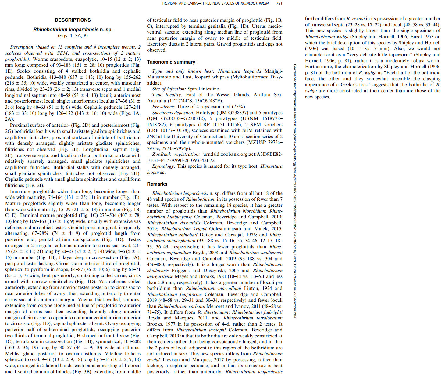 Trevisan, B. and J. N. Caira. 2020. Three new species of Rhinebothrium (Cestoda: Rhinebothriidea) from the leopard whipray, Himantura leoparda, in Australia. Journal of Parasitology 106(6): 789-801.