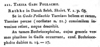 | Scientific Name Notes | -In order to avoid the confusion caused by a very simple and inadequate original description of Taenia gadipollachii, Nybelin (1922) proposed Parabothrium bulbiferum as a new name for tapeworms found in gadids that do not belong to Abothrium gadi. P. bulbiferum |