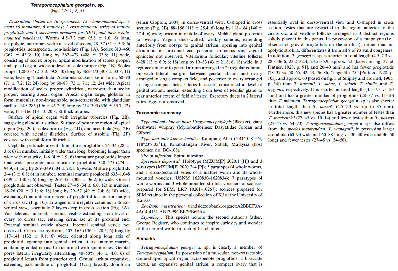 Jensen, K. and R. Guyer. 2021. First report of Lecanicephalidean tapeworms (Eucestoda) from freshwater, including description of three new species of Tetragonocephalum Shipley and Hornell, 1905. Journal of Parasitology 107(1): 1-15. (7230) Download PDF |