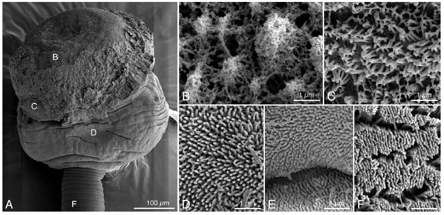 Figure 2. Scanning electron micrographs of Tetragonocephalum georgei n. sp. (A) Scolex; small letters indicate location of details shown in B–D, and F. (B) Surface of apical organ. (C) Surface of posterior region of apical organ. (D) Surface of scolex proper at level of acetabula (E) Surface of acetabula. (F) Surface of strobila.