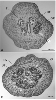 level anterior to cirrus sac. (B) At level of ovary anterior to ovicapt. Abbreviations: OV, ovary; T, testis; UT, uterus; VA, vagina; VF, vitelline