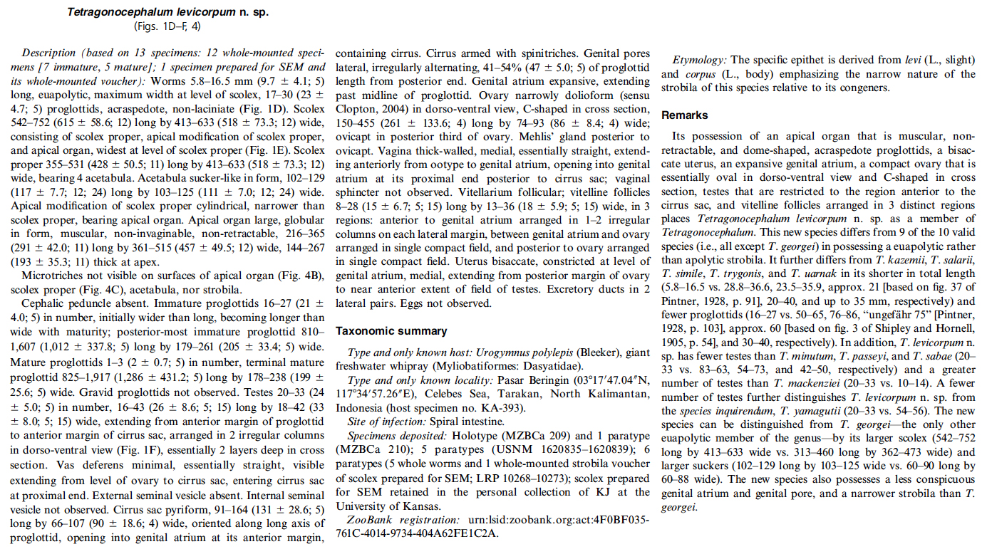 Jensen, K. and R. Guyer. 2021. First report of Lecanicephalidean tapeworms (Eucestoda) from freshwater, including description of three new species of Tetragonocephalum Shipley and Hornell, 1905. Journal of Parasitology 107(1): 1-15.