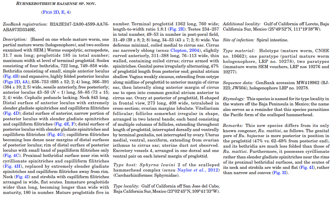 | Type Material | CNHE no. 10662 (Holotype, mature worm); one paratype (partial mature worm hologenophore, LRP no. 10278), two paratypes (immature worm SEM vouchers, LRP nos 10276 and 10277) |