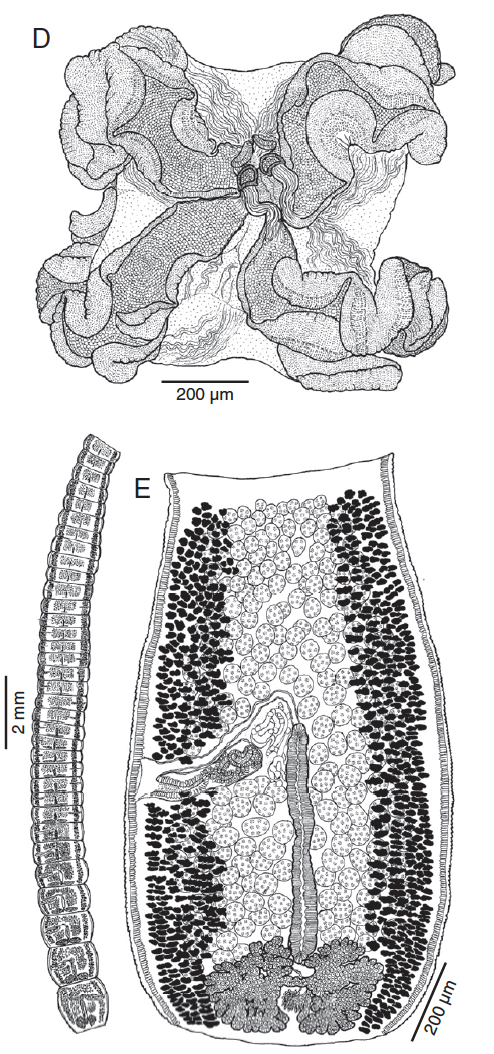 Figure 2. Line drawings of adults of Ruhnkebothrium (specimen accession numbers in parentheses). D, scolex of Ruhnkebothrium bajaense (CNHE no. 10662). E, mature proglottid of Ru. bajaense (CNHE no. 10662).