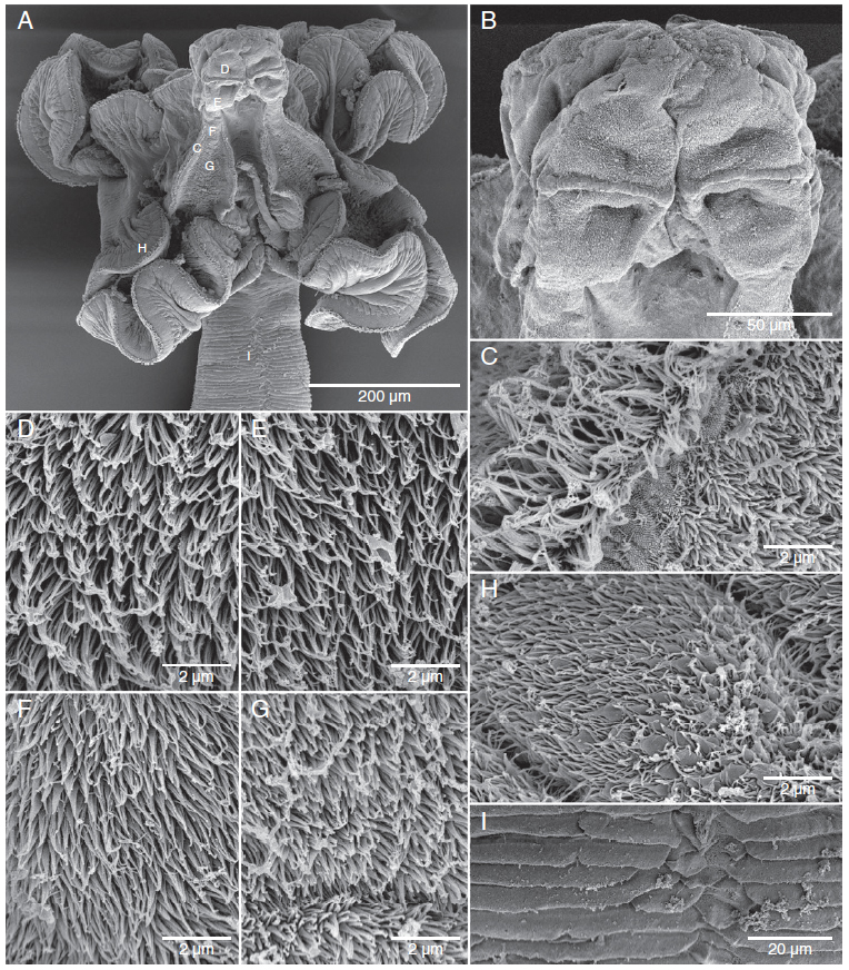 loculus adjacent to anterior loculus. F, distal surface of posterior loculus as it expands. G, distal surface of expanded region of posterior loculus. H, proximal surface of posterior loculus. I, scutes on surface of neck.