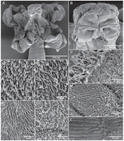 Figure 4. Scanning electron micrographs of Ruhnkebothrium bajaense. A, scolex. B, detail of anterior loculi. C, distal surface of rim of posterior loculus. D, distal surface of anterior loculus. E, distal surface of anterior-most region of posterior
