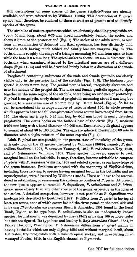 Williams, H. H. 1968. Phyllobothrium piriei sp. nov. (Cestoda: Tetraphyllidea) from Raja naevus with a comment on its habitat and mode of attachment. Parasitology 58: 929-937.