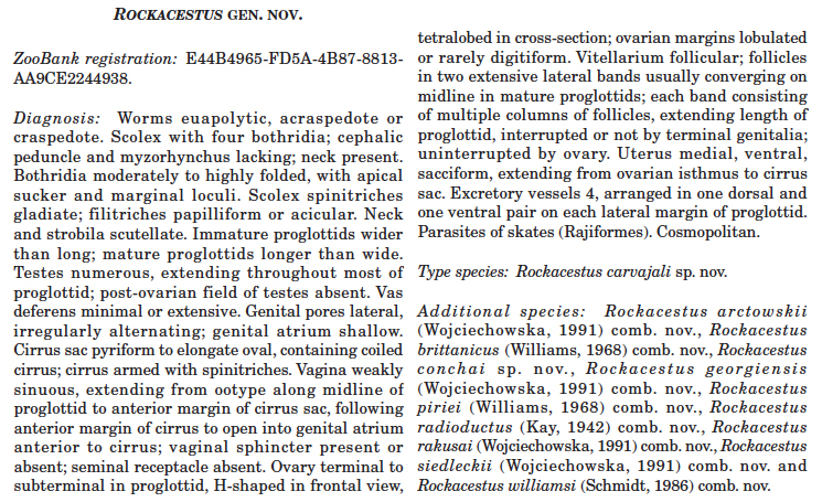 Kay, M. W. 1942. A new species of Phyllobothrium van Beneden from Raja binoculata (Girard). Transactions of the American Microscopical Society 61: 261-266. (256) Download PDFCaira, J. N., V. Bueno, and K. Jensen. 2021. Emerging global novelty in phyllobothriidean tapeworms (Cestoda: Phyllobothriidea) from sharks and skates (Elasmobranchii). Zoological Journal of the Linnean Society : 1-29. (7240) Download PDF |