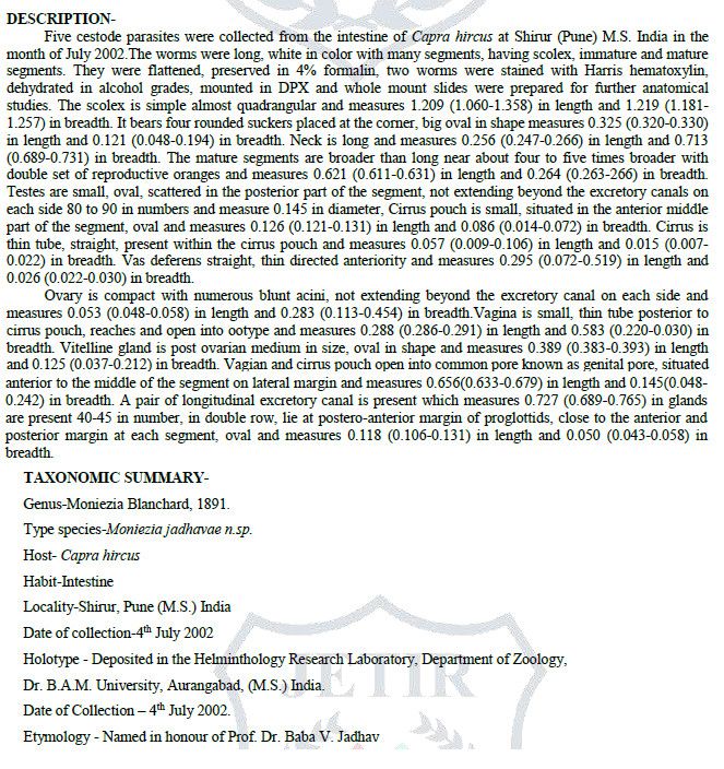 | Scientific Name Notes | Homonym of Moniezia jadhavae Hiware & Jadhav, 1996. Probably a junior synonym of Moniezia expansa (Rudolphi, 1810) Blanchard, 1891. |