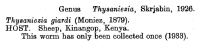 Moniez, R. 1879. Sur le Taenia giardi et sur quelques espèces du groupe des Inermes. Comptes Rendus Hebdomadaires des Seances de l’Academie des Sciences 88: 1094-1096. (5604) Download PDFHudson, J. R. 1934. A list of cestodes known to occur in East African mammals, birds & reptiles. Journal of the East Africa and Uganda Natural History Society 49-50: 205-217. (4156) Download PDF |