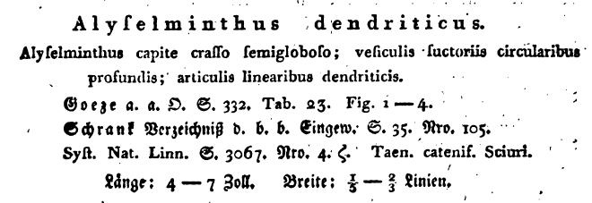 Goeze, J. A. E. 1782. Versuch einer Naturgeschichte der Eingeweidewürmer thierischer Körper. Gedruckt bey Philipp Adam Pape, Blankenburg, 471 pp & 44 plat pp. (4166) Download PDFZeder, J. G. H. 1800. Erster Nachtrag zur Naturgeschichte der Eingeweidewürmer von Johann August Ephraim Goeze. Crusius, Leipzig, 320 + 6 Kupferta pp. (712) Download PDF |