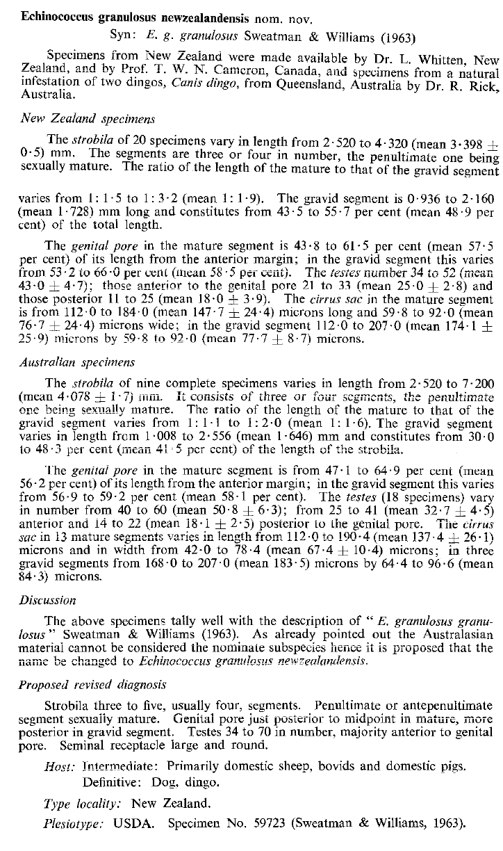 | Host Notes | Definitive hosts dog and dingo. Intermediate hosts sheep, bovids and pig. Type host not specified. |