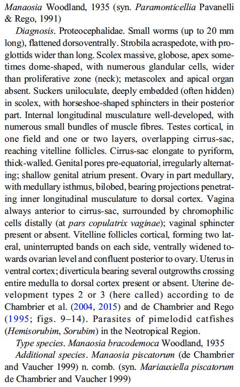 de Chambrier, A. and C. Vaucher. 1999. Proteocephalidae et Monticelliidae (Eucestoda: Proteocephalidea) parasites de poissons d’eau douce au Paraguay, avec descriptions d’un genre nouveau et de dix especes nouvelles. Revue Suisse de Zoologie 106: 165-240. (3925) Download PDFAlves, P. V., A. de Chambrier, J. L. Luque, R. M. Takemoto, L. E. R. Tavares, and T. Scholz. 2021. New arrangement of three genera of fish tapeworms (Cestoda: Proteocephalidae) in catfishes (Siluriformes) from the Neotropical Region: taxonomic implications of molecular phylogenetic analyses. Parasitology Research 120: 1593-1603. (7325) Download PDF |