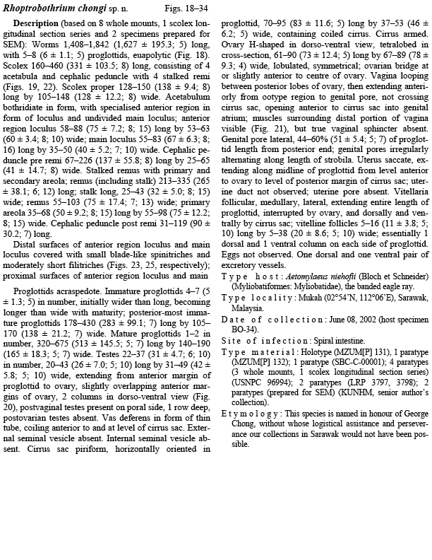 | Type Material | Holotype (MZUM (P) 131) and 1 paratype (MZUM (P) 132); 1 paratype (SBC-C-00001); 4 paratypes (3 whole mounts, 1 scolex longitudinal section series) (USNPC No. 96994); 2 paratypes (LRP Nos. 3797, 3798); 2 paratypes (prepared for SEM) (KUNHM, authors collection) |