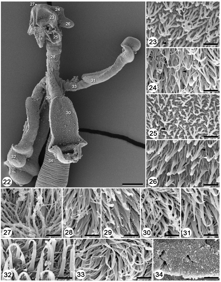 posterior to remi. Fig. 30. Microtriches on distal surface of remus. Fig. 31. Microtriches on proximal surface of remus. Fig. 32. Microtriches on proximal surface of primary areola. Fig. 33. Microtriches on stalk. Fig. 34. Microtriches on immature proglottid. Note: In Figs. 2326, 32, black arrowheads indicate spinitriches and white arrowheads indicate filitriches. Scale bars: Fig. 22 = 50 μm; Figs. 2334 = 1 μm.