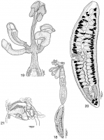 Figs. 1821. Line drawings of Rhoptrobothrium chongi sp. n. Fig. 18. Whole worm (paratype, USNPC 96994). Fig. 19. Scolex (holotype, MZUM[P] 131). Fig. 20. Terminal, mature proglottid (paratype, USNPC 96994). Fig. 21. Detail of terminal genitalia of mature proglottid (paratype, USNPC 96994).