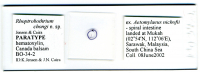Jensen, K. and J. N. Caira. 2006. The status of Rhoptrobothrium Shipley et Hornell, 1906 (Cestoda: Tetraphyllidea), with redescription of the type species, R. myliobatidis, and description of three new species from two species of Aetomylaeus (Myliobatiformes: Myliobatidae) from Malaysian Borneo. Folia Parasitologica 53: 189-207. (4505) Download PDFJensen, K., I. A. M. Pen, and J. N. Caira. 2021. A revision of the Rhoptrobothriidae (Cestoda: "Tetraphyllidea"). Zootaxa 4999(3): 201-218. (7364) Download PDF |
