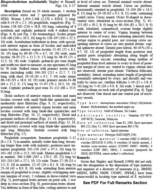 Shipley, A. E. and J. Hornell. 1906. Report on the cestode and nematode parasites from the marine fishes of Ceylon. Report to the Government of Ceylon on the Pearl Oyster Fisheries of the Gulf of Manaar (Herdman), Part 5 5: 43-96. (431) Download PDFJensen, K., I. A. M. Pen, and J. N. Caira. 2021. A revision of the Rhoptrobothriidae (Cestoda: "Tetraphyllidea"). Zootaxa 4999(3): 201-218. (7364) Download PDF |