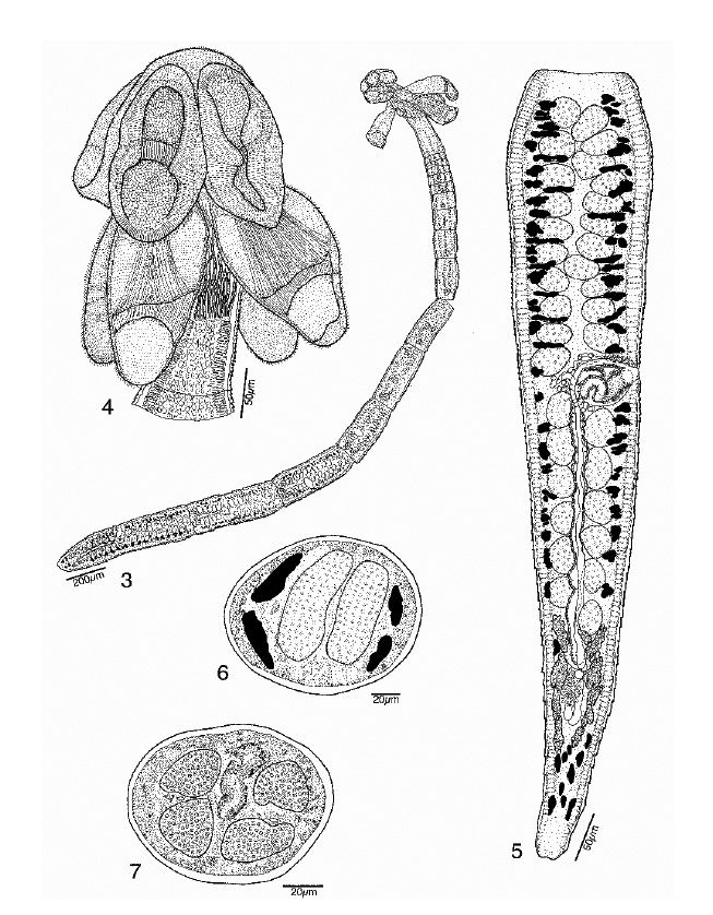 Figs. 3-7. Line drawings of Rhoptrobothrium myliobatidis Shipley et Hornell, 1906. Fig. 3. Whole worm (neotype, MSUM[P] 136). Fig. 4. Scolex (voucher, USNPC 96997). Fig. 5. Terminal, mature proglottid (voucher, USNPC 96998). Fig. 7. Cross-section through mature proglottid at level of ovary (slightly posterior to ovarian bridge) (voucher, USNPC 96998).