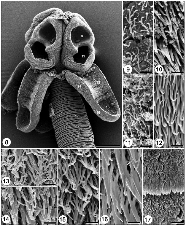 Figs. 8-17. Scanning electron micrographs of Rhoptrobothrium myliobatidis Shipley et Hornell, 1906. Fig. 8. Scolex. Note: Numbers correspond to the figures showing higher magnification images of these surfaces. Fig. 9. Microtriches on distal acetabular surface of anterior region loculus. Fig. 10. Microtriches on proximal acetbular surafce of anterior region loculus. Fig. 11. Microtriches on distal acetabular surface of main loculus. Fig. 12. Microtriches on proximal acetabular surface of main loculus. Fig. 13. Microtriches on distal surface of remus. Fig. 14. Microtriches on proximal surface of remus. Fig. 15. Microtriches on distal surface of primary areola. Fig. 16. Microtriches on proimal surface of primary areola. Fig. 17. Microtriches on immature proglottid. Scale bars: Fig. 8 = 50µm; Figs. 9-17 = 1µm.