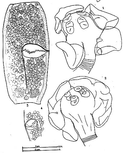 FIGURES 1-4. Mixophyllobothrium okamuri n. sp. 1-2. Scolex. 3. Mature segment. 4. Cirrus pouch and cirrus.