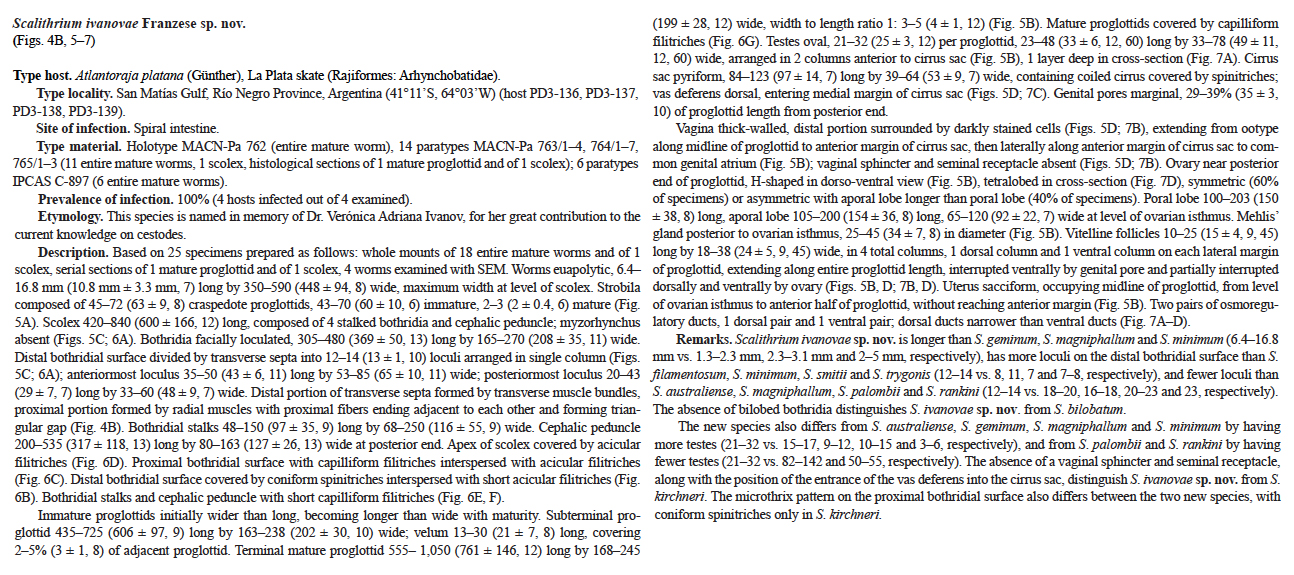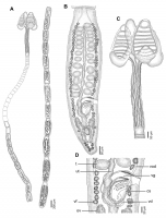 FIGURE 5. Line drawings of Scalithrium ivanovae sp. nov. from Atlantoraja platana. A. entire mature worm (holotype MACNPa 762); B. terminal mature proglottid (holotype MACN-Pa 762); C. scolex (holotyp... MoreFIGURE 5. Line drawings of Scalithrium ivanovae sp. nov. from Atlantoraja platana. A. entire mature worm (holotype MACNPa 762); B. terminal mature proglottid (holotype MACN-Pa 762); C. scolex (holotype MACN-Pa 762); D. detail of terminal genitalia in a terminal mature proglottid (holotype MACN-Pa 762). Abbreviations: cs, cirrus sac; ov, ovary; t, testes; ut, uterus; vd, vas deferens; vf, vitelline follicle; vg, vagina; vod, ventral osmoregulatory duct. |