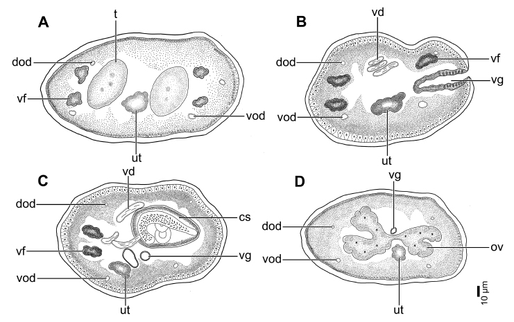 FIGURE 7. Cross sections of terminal mature proglottid of Scalithrium ivanovae sp. nov. from Atlantoraja platana (paratype MACN-Pa 763/3) A. cross section at the level of testes; B. cross section at t... MoreFIGURE 7. Cross sections of terminal mature proglottid of Scalithrium ivanovae sp. nov. from Atlantoraja platana (paratype MACN-Pa 763/3) A. cross section at the level of testes; B. cross section at the level of the genital pore; C. cross section at the level of the cirrus sac; D. cross section at the level of the ovarian isthmus. Abbreviations: cs, cirrus sac; dod, dorsal osmoregulatory duct; ov, ovary; t, testes; ut, uterus; vd, vas deferens; vf, vitelline follicle; vg, vagina; vod, ventral osmoregulatory duct. |