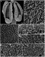 FIGURE 6. Scanning electron micrographs of Scalithrium ivanovae sp. nov. from Atlantoraja platana. A. scolex, small letters indicate the location of details shown in figures 6B–F; B. distal bothridial... MoreFIGURE 6. Scanning electron micrographs of Scalithrium ivanovae sp. nov. from Atlantoraja platana. A. scolex, small letters indicate the location of details shown in figures 6B–F; B. distal bothridial surface; C. proximal bothridial surface; D. surface of scolex apex; E. surface of stalk; F. surface of cephalic peduncle; G. surface of terminal mature proglottid. |