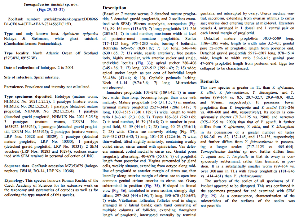 | Type Material | Holotype (mature worm, NHMUK No. 2021.5.25.2), 1 paratype (mature worm, NHMUK No. 2021.5.25.3), 1 paratype (detached mature proglottid, NHMUK No. 2021.5.25.4), 1 paratype (detached gravid proglottid, NHMUK No. 2021.5.25.5); 3 paratypes (mature worms, USNM Nos. 1655922–1655924), 1 paratype (detached gravid proglottid, USNM No. 1655925); 2 paratypes (mature worms, LRP Nos. 10328 and 10329), 1 paratype (detached mature proglottid, LRP No. 10330), 1 paratype (detached gravid proglottid, LRP No. 10331) |