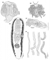 Figs 33–37. Line drawings of Yamaguticestus kuchtai sp. nov. 33, scolex (holotype, NHMUK No. 2021.5.25.2); 34, whole worm (paratype, USNM No. 1655922); 35, detached mature proglottid (paratype, NHMUK No. 2021.5.25.4); 36, detail of ovary (paratype, NHMUK No. 2021.5.25.5); 37, detail of terminal genitalia (paratype, NHMUK No. 2021.5.25.5)