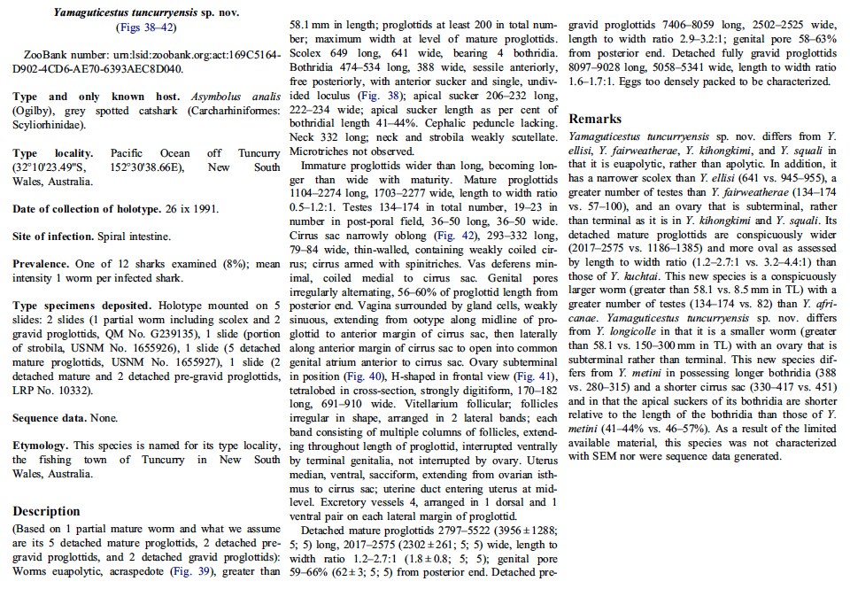 | Type Material | Holotype mounted on 5 slides: 2 slides (1 partial worm including scolex and 2 gravid proglottids, QM No. G239135), 1 slide (portion of strobila, USNM No. 1655926), 1 slide (5 detached mature proglottids, USNM No. 1655927), 1 slide (2 detached mature and 2 detached pre-gravid proglottids, LRP No. 10332) |
