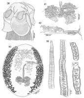 Figs 38–42. Line drawings of Yamaguticestus tuncurryensis sp. nov. 38, scolex (holotype, QM No. G239135); 39, whole worm (holotype, QM No. G239135); 40, detached mature proglottid (holotype, USNM No. 1655927); 41, detail of ovary (holotype, USNM No. 1655927); 42, detail of terminal genitalia (holotype, USNM No. 1655927)