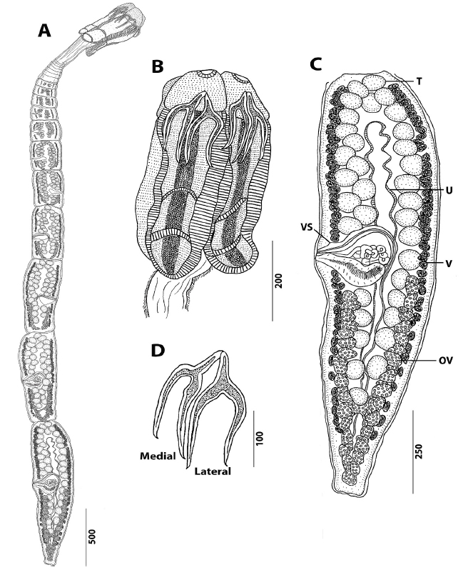 Fig. 1. Line drawings of Acanthobothrium umbungus n. sp. A entire specimen (holotype; accession no. XXX); B scolex; C mature proglottid (VS, vaginal sphincter; T, testis; U, uterus; V, vitelline follicle; OV, ovary); D hooks.