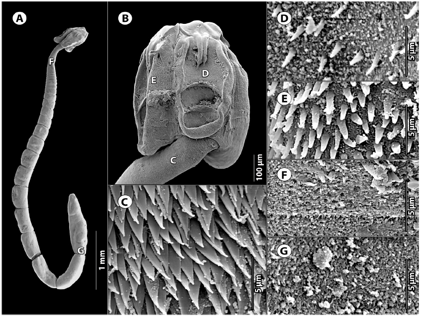 Fig. 2. Scanning electron micrographs of Acanthobothrium umbungus n. sp. A entire specimen, letters indicate where micrographs of microtriches were taken; B scolex, letters indicate where micrographs of microtriches were taken; C cephalic peduncle; D distal bothridial surface; E proximal bothridial surface, near medial margin of bothridium; F first proglottid; G anterior region of terminal proglottid.