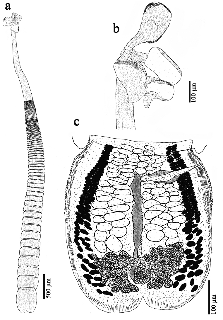Fig. 1 Anthobothrium parimae sp. nov. a Whole worm. b Scolex. c Mature proglottid