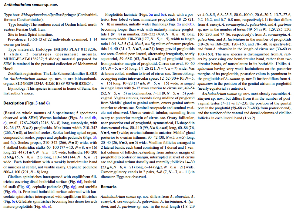 Sadeghi Kamachali, M. and M. Haseli. 2022. Three new species of Anthobothrium van Beneden, 1850 (Cestoda: “Tetraphyllidea”) from the grey sharpnose shark Rhizoprionodon oligolinx Springer, 1964 (Carcharhinidae) in the Persian Gulf. Parasitology Research 121: 143-154.