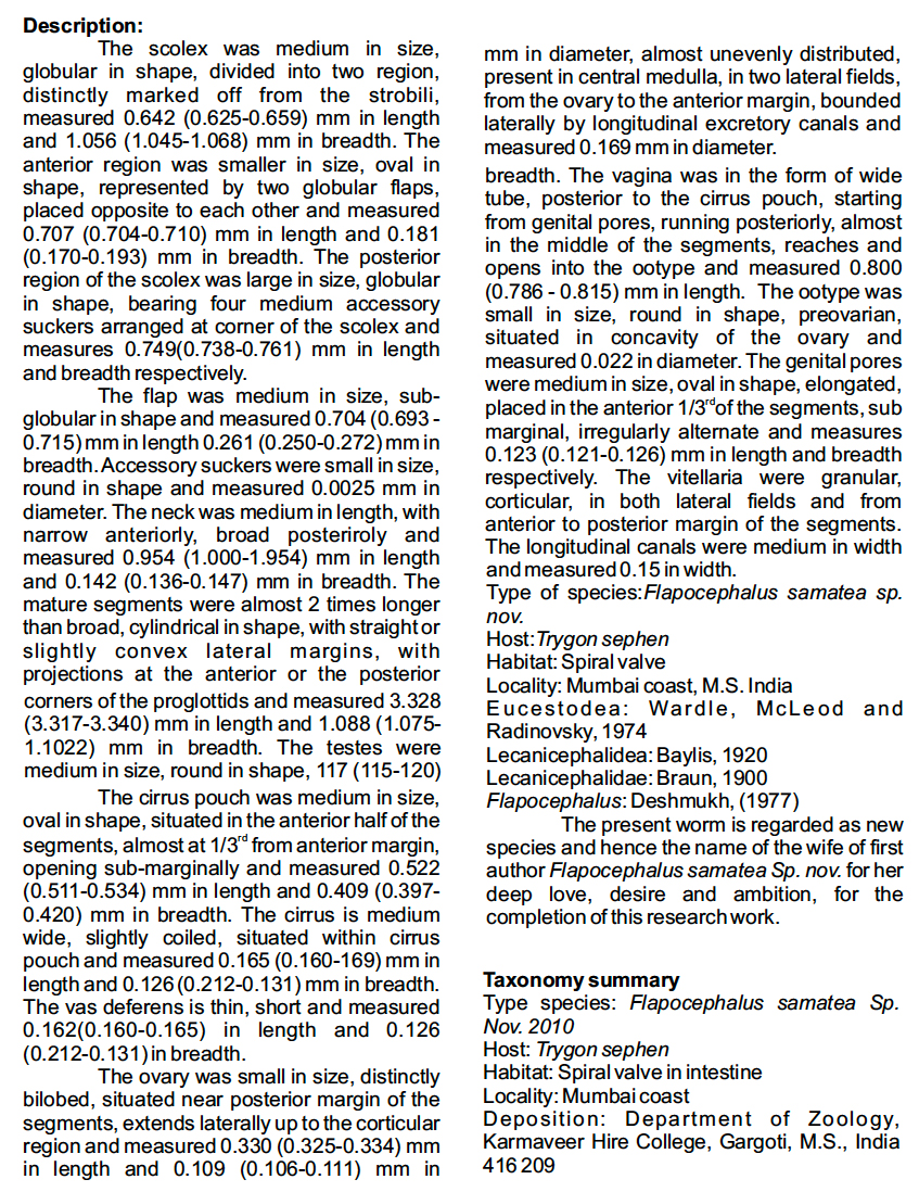 Jagtap, V. A. and S. A. Vhanalakar. 2021. New cestode parasite Flapocephalus samatea sp. nov. of Trygon sephen from Mumbai Coast, Maharashtra. Bioinfolet 18(4): 515-517. (7414) Download PDF |