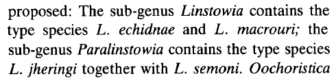 Zschokke, F. 1898. Die Cestoden der Marsupialia und Monotremata. Denkschriften der Medizinisch-Naturwissenschaftlichen Gesellschaft zu Jena 8: 357-380. (4997) Download PDFBeveridge, I. 1983. The genus Linstowia Zschokke, 1899 (Cestoda: Anoplocephalidae) in Australian mammals with the description of a new species, L. macrouri. Systematic Parasitology 5: 291-304. (4694) Download PDF |