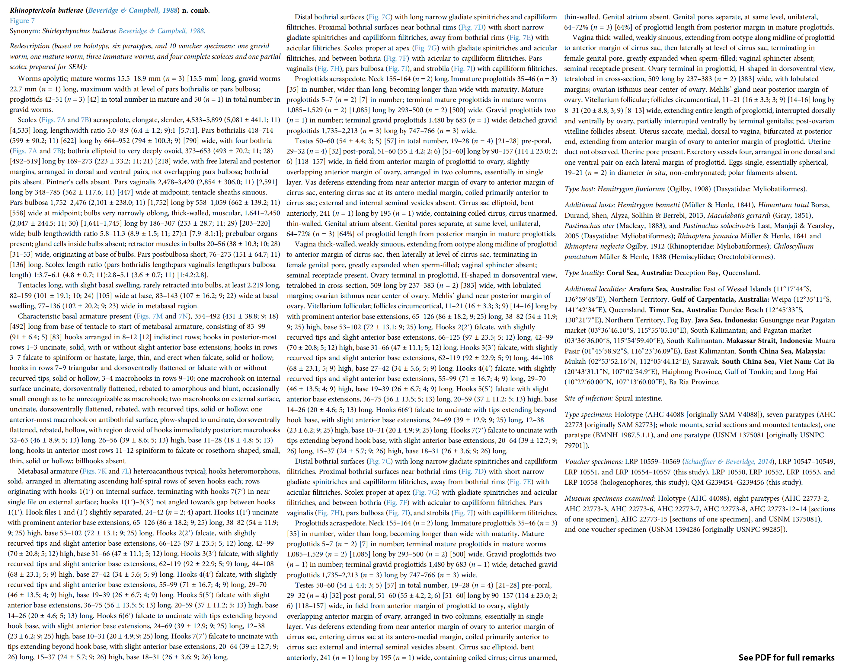 | Additional Host(s) | Dasyatis sephen; Additional hosts from redescription: Hemitrygon bennetti (Müller & Henle, 1841), Himantura tutul Borsa, Durand, Shen, Alyza, Solihin & Berrebi, 2013, Maculabatis gerrardi (Gray, 1851), Pastinachus ater (Macleay, 1883), and Pastinachus solocirostris Last, Manjaji & Yearsley, 2005 (Dasyatidae: Myliobatiformes); Rhinoptera javanica Müller & Henle, 1841 and Rhinoptera neglecta Ogilby, 1912 (Rhinopteridae: Myliobatiformes); Chiloscyllium punctatum Müller & Henle, 1838 (Hemiscyliidae; Orectolobiformes) | ||||||