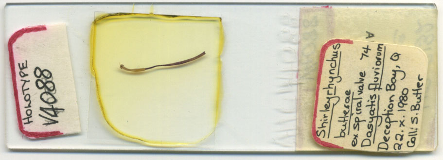 | Scientific Name Notes | This species was first allocated tentatively to the Gilquiniidae by Beveridge & Campbell (1988) and then to the Shirleyrhynchidae by Campbell & Beveridge (1994). When Beveridge & Campbell (1998) moved Tetrarhynchus aetobatidis Shipley & Hornell, 1906 to the genus Shirleyrhynchus as Shirleyrhynchus aetobatidis (Shipley & Hornell, 1906) Beveridge & Campbell, 1998, they synonymized S. aetobatidis and Shirleyrhynchus butlerae Beveridge & Campbell, 1988, briefly making S. butlerae and junior synonym of S. aetobatidis. However, Schaeffner (2016) resurrected S. butlerae from synonomy. |