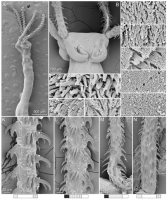 From Herzog & Jensen, 2022 (Cit# 7426). Figure 7 Scanning electron micrographs of Rhinoptericola butlerae (Beveridge & Campbell, 1988) n. comb. (A) Scolex; small letter indicates the location of details shown in (H–I). (B) Bothria and basal armature; small letters indicate the location of details shown in (C–G). (C) Distal bothrial surface. (D) Proximal bothrial surface near the bothrial rim. (E) Proximal bothria surface away from the bothrial