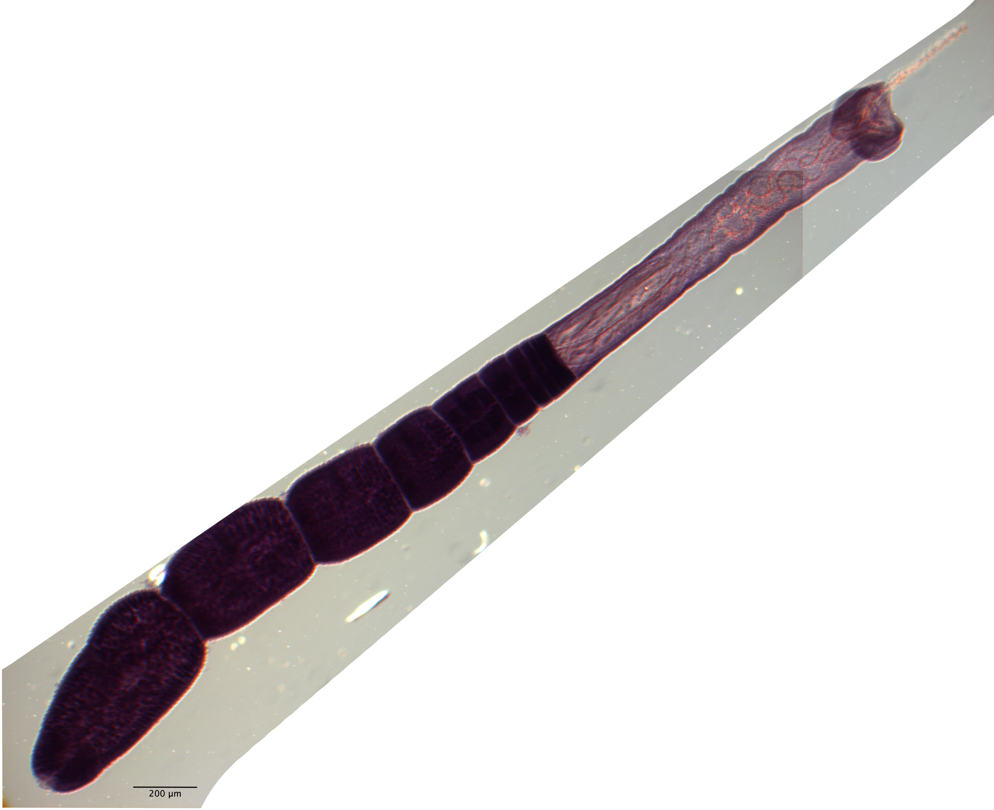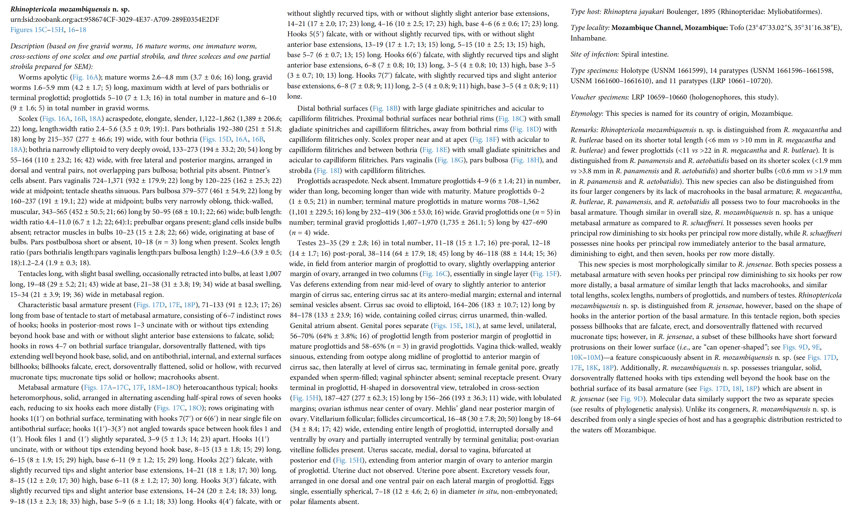 | Total Number of Type Specimens | based on five gravid worms, 16 mature worms, one immature worm, cross-sections of one scolex and one partial strobila, and three scoleces and one partial strobila prepared for SEM |
