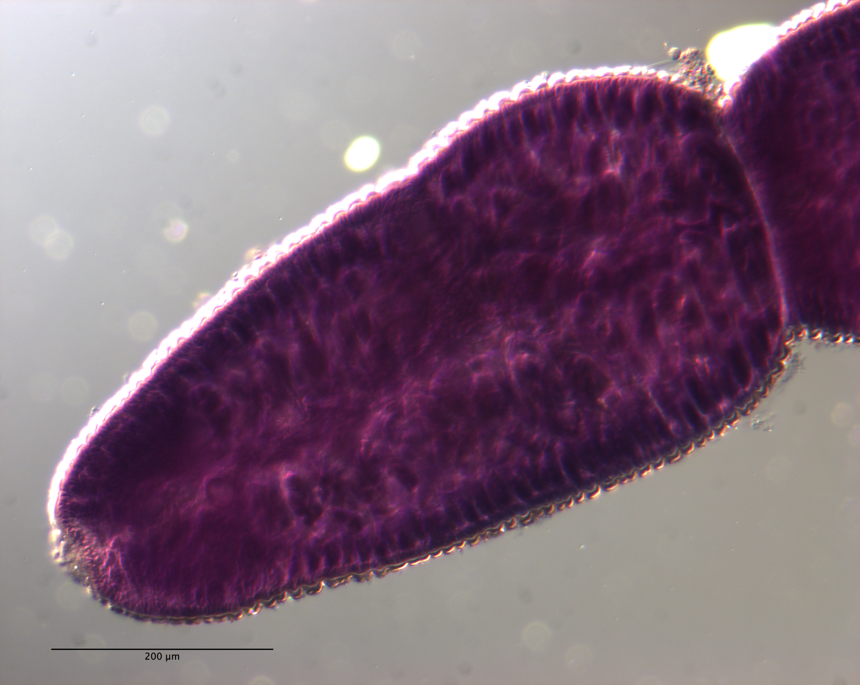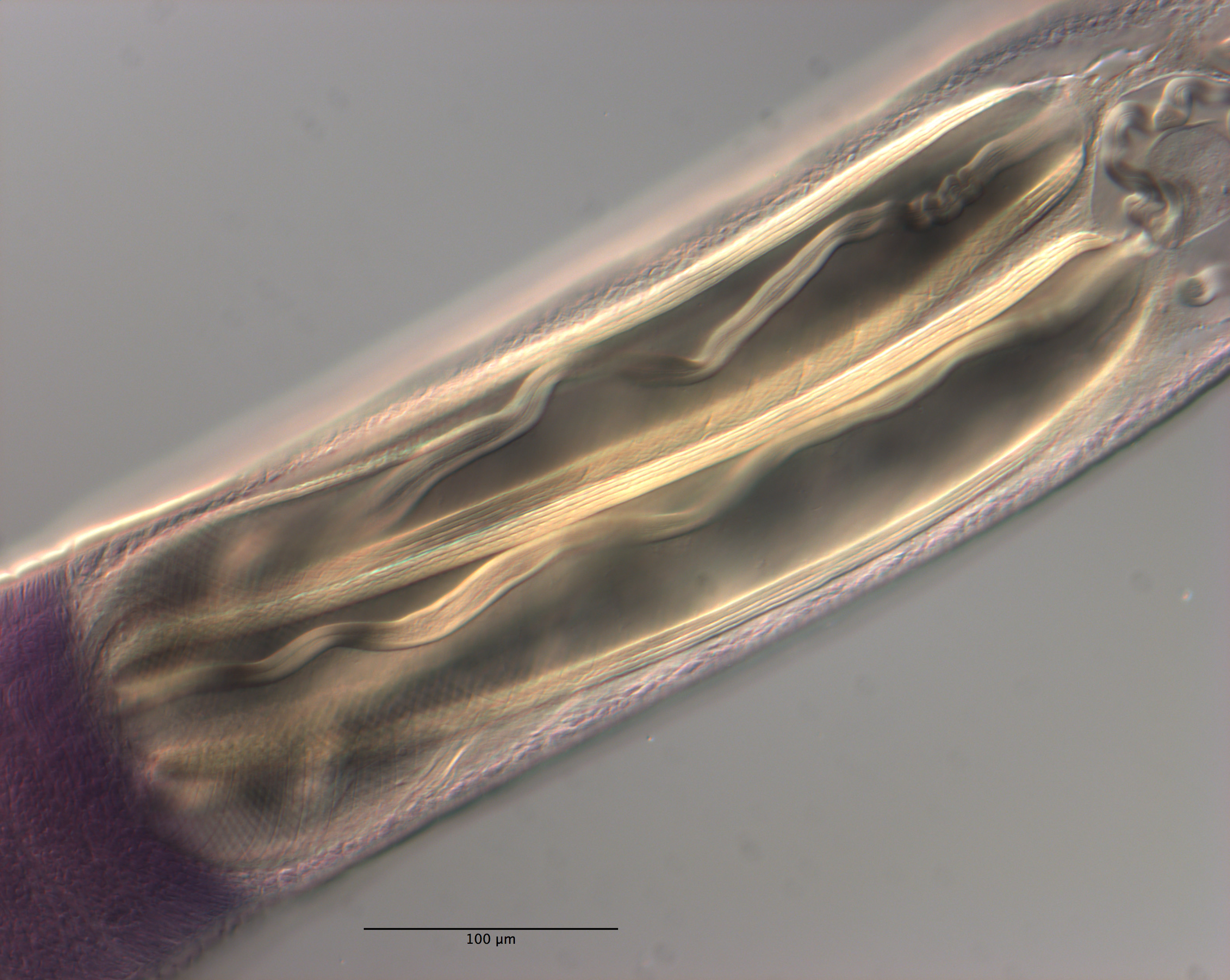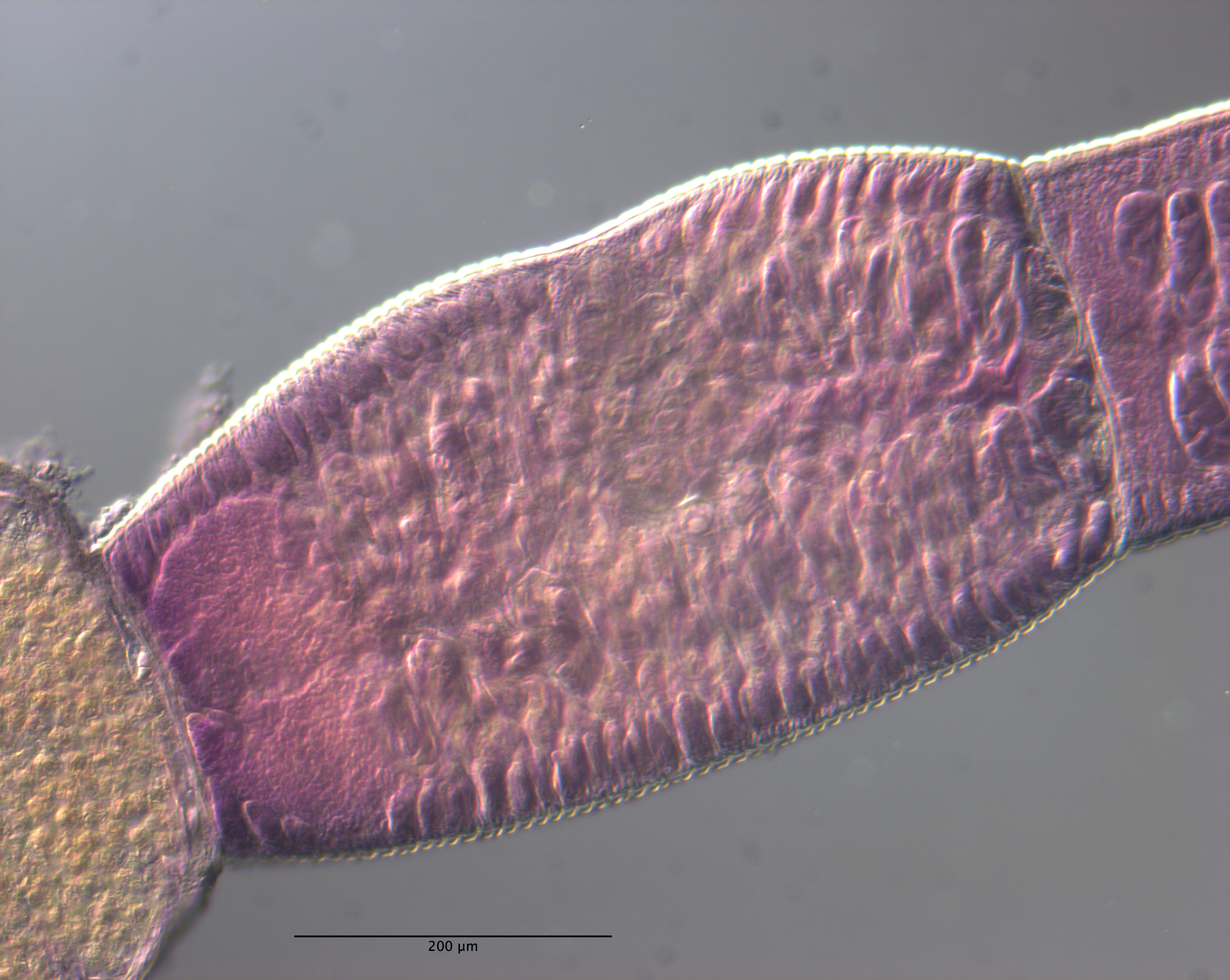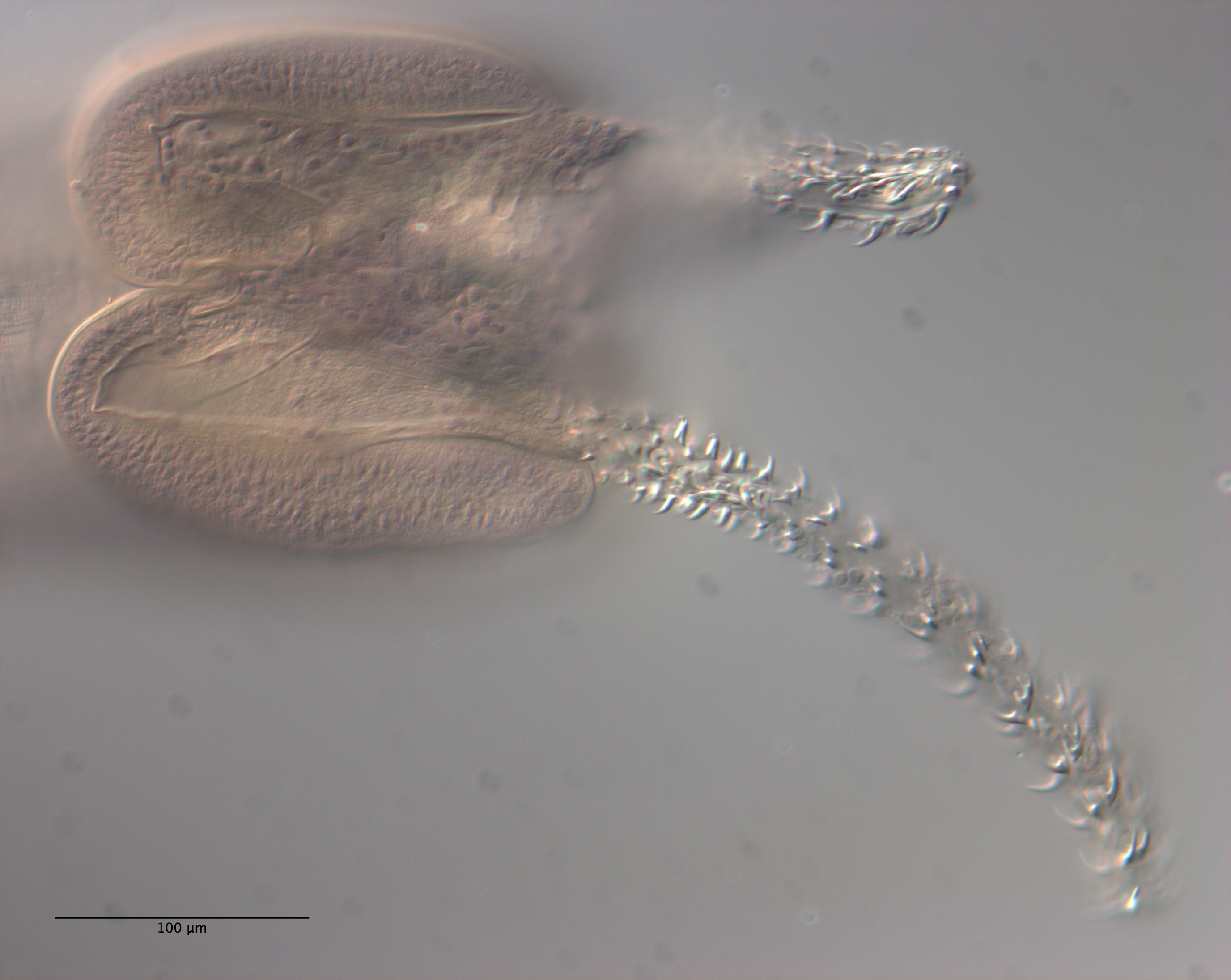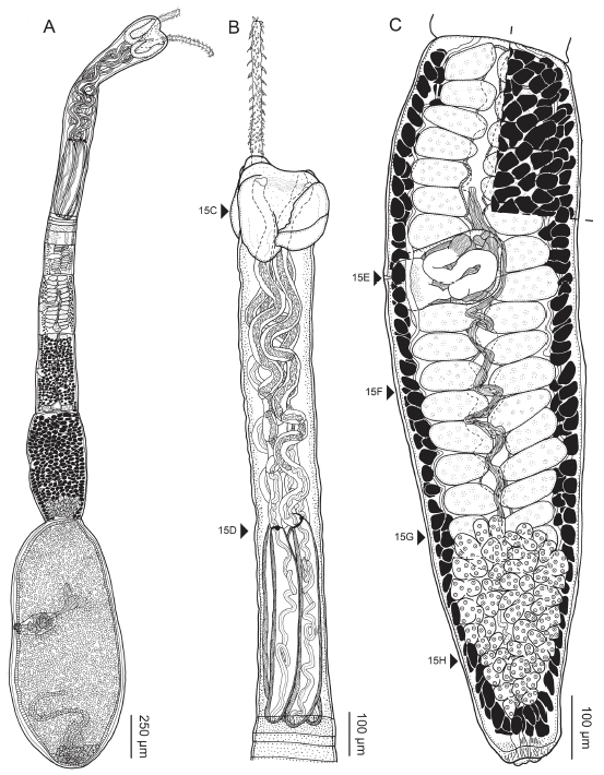 holotype). (B) Scolex (USNM 1661596; paratype). (C) Terminal proglottid (USNM 1661598; paratype); circumcortical vitelline follicles are drawn only on the lateral margins and in the region delimited by dashed lines. Arrowheads indicate the level at which the sections in Fig. 15 were taken. Full-size image DOI: 10.7717/peerj.12865/fig-16