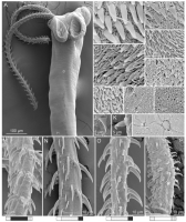 Figure 18 Scanning electron micrographs of Rhinoptericola mozambiquensis n. sp. (A) Scolex; small letters indicate the location of details shown in (B–H). (B) Distal bothrial surface. (C) Proximal bothria