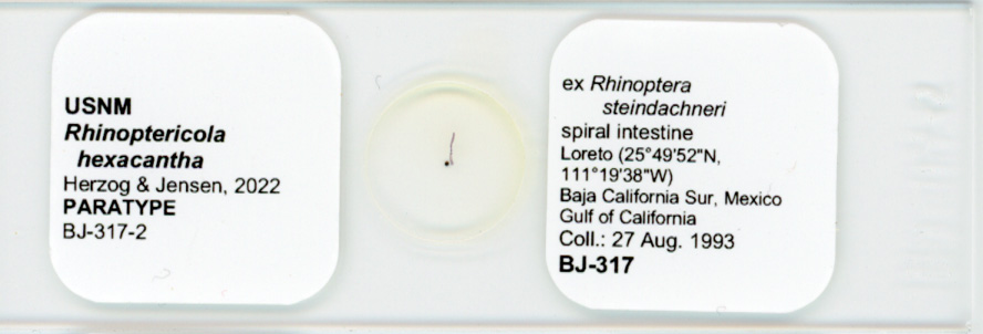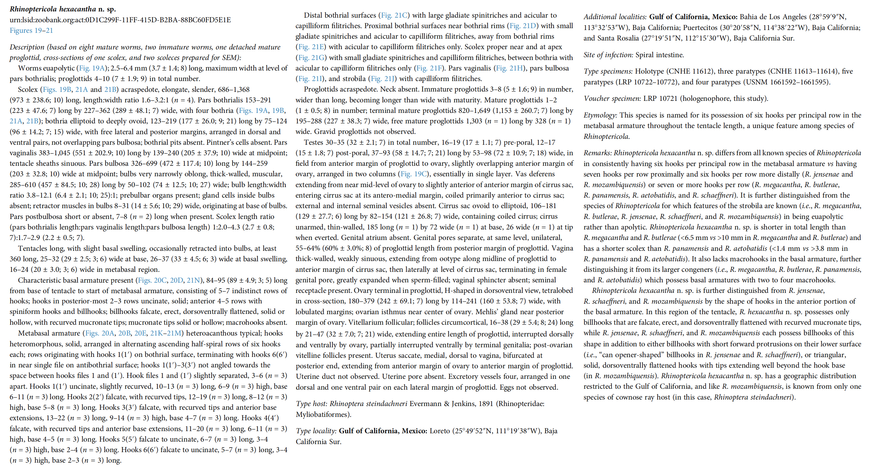 | Total Number of Type Specimens | based on eight mature worms, two immature worms, one detached mature proglottid, cross-sections of one scolex, and two scoleces prepared for SEM |