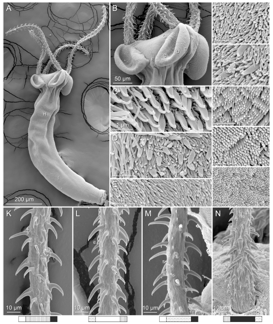 Figure 21 Scanning electron micrographs of Rhinoptericola hexacantha n. sp. (A) Scolex; small letters indicate the location of details shown in (H–J). (B) Bothria and basal armature; small letters indicate the location of details shown in (C–G). (C) Distal bothrial surface. (D) Proximal bothrial surface near the bothrial rim. (E) Proximal bothria surface away from the bothrial rim. (F) Surface of the scolex proper between the bothria. (G) Surface of the scolex proper at the apex. (H) Surface of the pars vaginalis. (I) Surface of the pars bulbosa. (J) Strobilar surface. (K) Metabasal armature, bothrial surface. (L) Metabasal armature, internal surface. (M) Metabasal armature, antibothrial surface. (N) Basal armature, external surface. Full-size image DOI: 10.7717/peerj.12865/fig-21