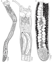 Figure 19 Line drawings of Rhinoptericola hexacantha n. sp. (A) Whole worm (USNM 1661594; paratype); specimen is not mature enough to exhibit circumcortical vitelline follicles in the terminal