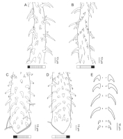armature, bothrial surface (LRP 10723; paratype). (B) Metabasal armature, antibothrial surface (LRP 10723; paratype). (C) Basal armature, bothrial surface (CNHE 11612; holotype). (D) Basal armature, antibothrial surface (CNHE 11612; holotype). (E) Comparison of metabasal hook shapes. Full-size image DOI: 10.7717/peerj.12865/fig-20